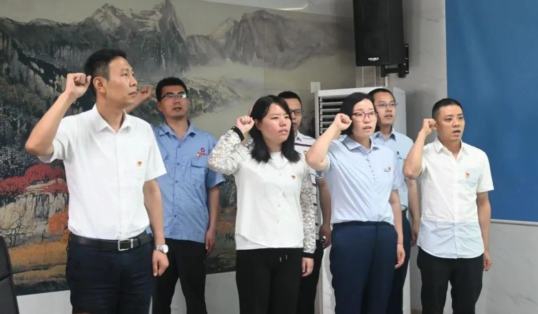 常豪帶領(lǐng)預(yù)備黨員進行入黨宣誓,全體高舉右拳,面向鮮紅的黨旗莊嚴宣誓!拔抑驹讣尤胫袊伯a(chǎn)黨,擁護黨的綱領(lǐng),遵守黨的章程,履行黨員義務(wù)... ...”以錚錚誓言表達了自己的決心和擔(dān)當(dāng)。